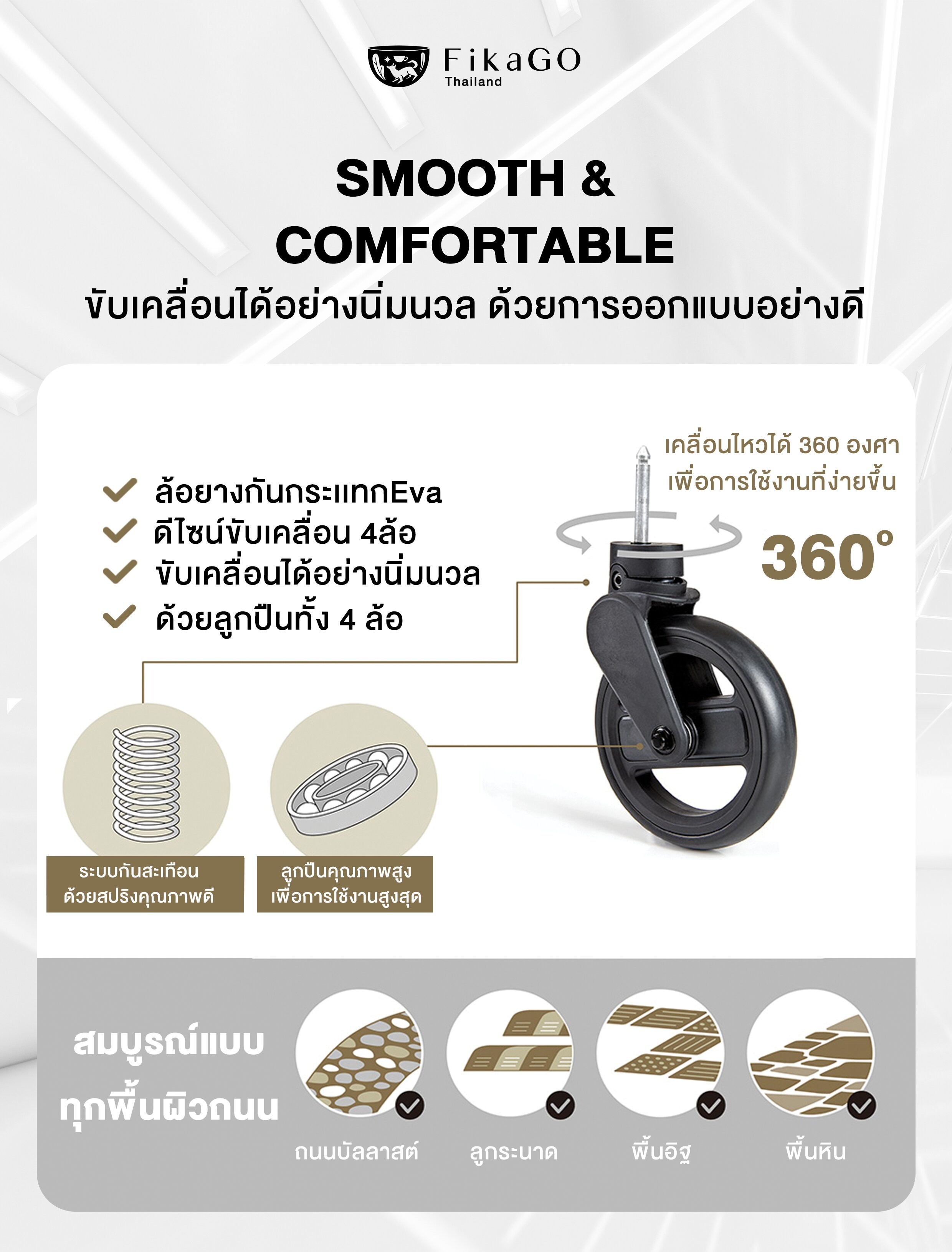 - เข็นลื่นไม่มีสะดุดด้วย ล้อหมุน 360° พร้อมระบบโช้คอัพกันสะเทือน เข็นลื่นในทุกพื้นผิว